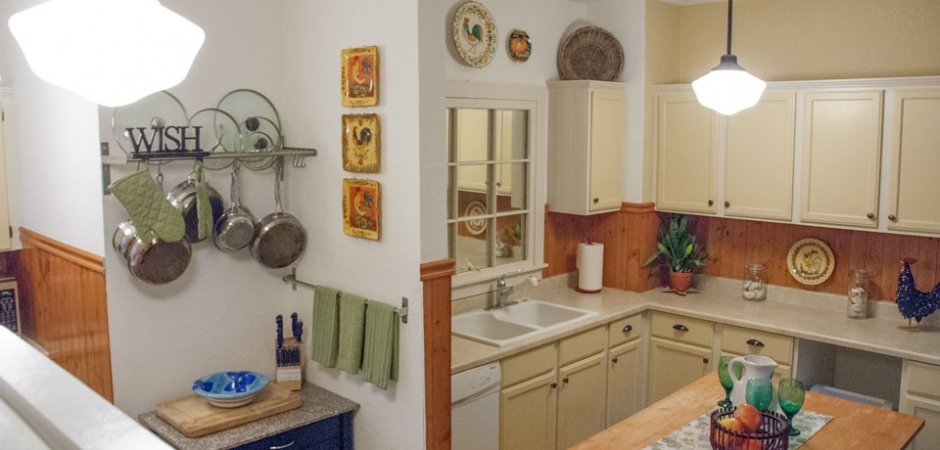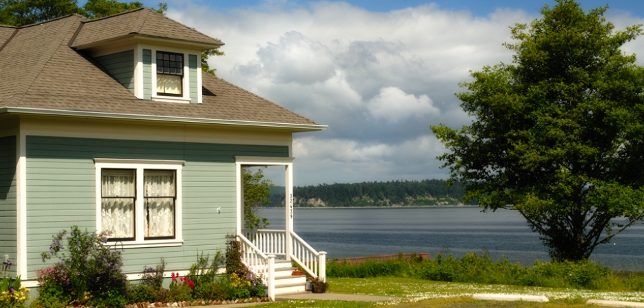 This distinguished, old home (the green house) has three comfortable bedrooms each with their own full bath, two sleeper sofas and can sleep up to ten people. It features a large, fully stocked kitchen, dining room and living room with a fireplace. The living room can be closed off to create a private suite for guests who desire even more spacious surroundings.